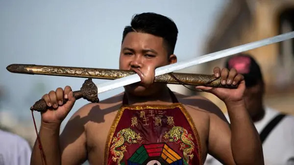 سالیانه فستیوالی عجیب و غریب در تایلند برپا میشود که افراد گیاه خوار با شرکت در این رویداد اجسام تیز و برنده همانند شمشیر، سیخ و ... را در صورت خود فرو میبرند.