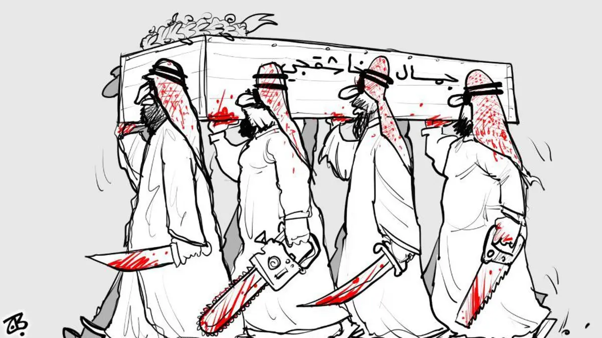 این پایگاه قطری در این کاریکاتور نمایش داده است که چطور سران سعودی پس از کشتن Killing جمال خاشقجی، روزنامه نگار منتقد سعودی، برای وی مرثیه سرایی می کنند. در این کاریکاتور قاتلان جمال خاشقجی به تصویر کشیده شدهاند که پس از تکه تکه کردن بدن وی، با اره و سلاح های سرد، زیر تابوت وی را گرفته و برای او عزاداری می کنند.