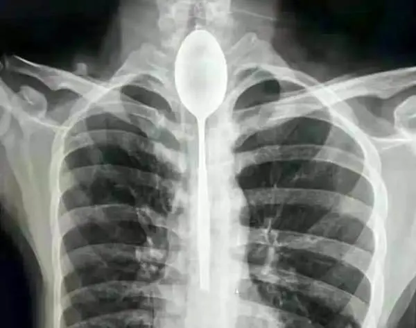 مردی که نامش فاش نشده است از منطقه جین جیانگ چین به پزشکان گفت :او یک قاشق فولادی ضد زنگ را در طی یک شرط درحالت مستی بلعیده . او به دوستانش گفته که می تواند قاشق را ببلعد و بعد دوباره با ریسمانی که به دسته قاشق می بندد آن را بیرون آورد . در آن زمان برای او حتما فکر خوبی به نظر می رسید، اما همه چیز طبق برنامه پیش نرفت و قاشق در گلوی او گیر کرد. به جای رفتن به بیمارستان، مرد منتظر ماند تا ببیند آیا قاشق به طور عادی از خوردن و نوشیدن جلوگیری می کند یا نه ؛ این طور نبود، پس در مری ماند تا سال گذشته.
