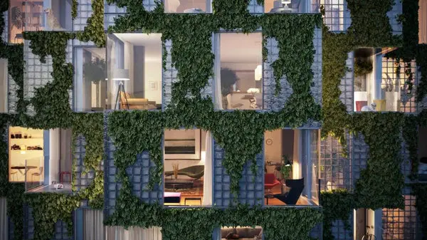 رکنا: نمای مجتمعی در تورنتو با استفاده از آجرهای شیشهای، بتن سفید، شیشه و بافت سبز طراحی شده است.