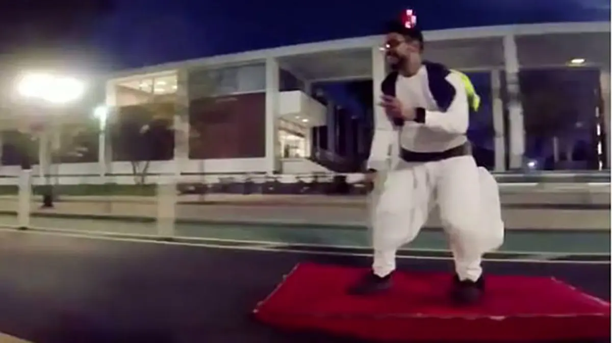 علاء الدینی که سوار بر فرش است «نیل» دانشجوی دانشگاه راتگرز است که در لباس کارتونی علاء الدینی دیزنی دست به هنر Art نمایی زده و اسکیت بورد الکتریکی خود را با قابلیت پرواز ساخته است.