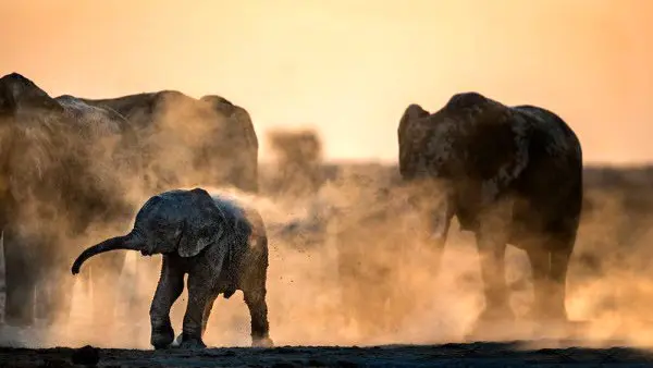 همانطور که در عکس مشخص است فیلها در هنگامه غروب آفتاب گرد و غباری به پا کردهاند که به اصطلاح گفته میشود آنها در حال دوش گرفتن و تمیز کردن یکدیگر با گل و گرد و غبار هستند.
