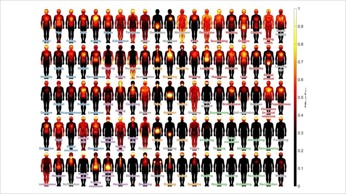 احساسات چیزهای جالبی هستند. عشق و دردقلب هر دو در سر شما اتفاق می افتند اما در جاهای مختلفی احساس می شوند. هیجان و ترس دو عاطفه ی کاملا متفاوت هستند اما تقریبا احساس مشابهی به انسان می دهند. پیچیده تر اینکه احساسات جسمانی هستند و افراد دیگر نیز آن ها را همان گونه که می فهمید حس می کنند. این موضوع مبحث مطالعه ی تیمی از محققان فنلاندی بود که به نتایج شگفت انگیزی منجر شد، آنها نقشه ی قسمت هایی از بدن که عواطف مختلف را احساس میکنند ترسیم کرده اند. اینگونه برمی آید که بیشتر ما عواطفمان را در قسمت های مشابهی احساس می کنیم.