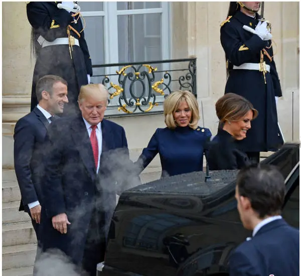 رکنا: هنگام خروج دونالد ترامپ و همسرش ملانیا از کاخ الیزه و بدرقه آنان توسط امانوئل مکرون و همسرش لیموزین رئیس جمهور آمریکا دود می کرد.