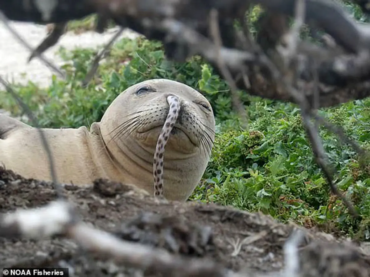 عکس منتشرشده توسط گروه تحقیقاتی Hawaiian Monk Seal Research Program نشان میدهد یک مار خالدار وارد بینی فک بندری شده است.