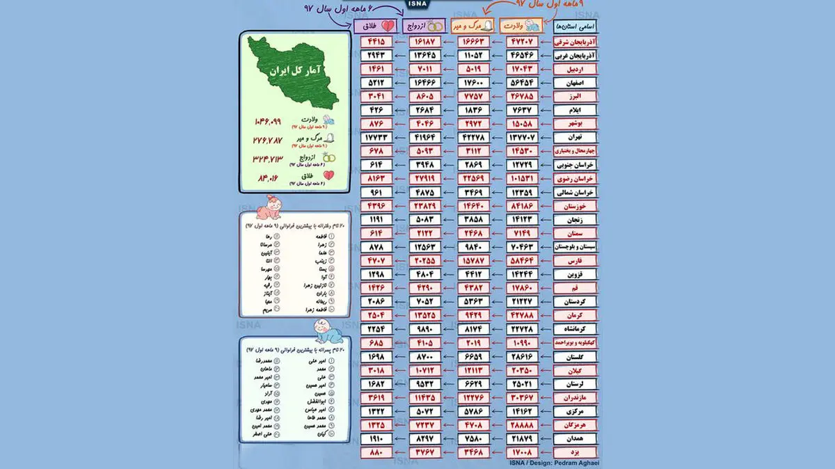 براساس گزارشهای منتشر شده سازمان ثبتاحوال،۲۰ نام دخترانه که در ۹ماهه سال ۹۷ در میان باقی اسامی بیشترین فراوانی را داشتهاند اعلام شده که شامل فاطمه، زهرا، حلما، زینب، یسنا، آوا، نازنین زهرا، باران، ریحانه، فاطمه زهرا، رها، مرسانا، آیلین، النا، مهرسا، بهار، رقیه، آیناز، محیا و مریم است. همچنین نامهای امیرعلی، محمد، علی، امیرحسین، حسین، ابوالفضل، امیرعباس، محمد طاها، محمد حسین، کیان، محمدرضا، ماهان، امیرمحمد، سامیار، آراد، مهدی، محمدمهدی، امیررضا، محمدامین و علی اصغر ۲۰ اسامی پسرانهای هستند که در ۹ ماهه سال ۹۷ فراوانی بسیاری داشتند.اخبار 24 ساعت گذشته رکنا را از دست ندهید