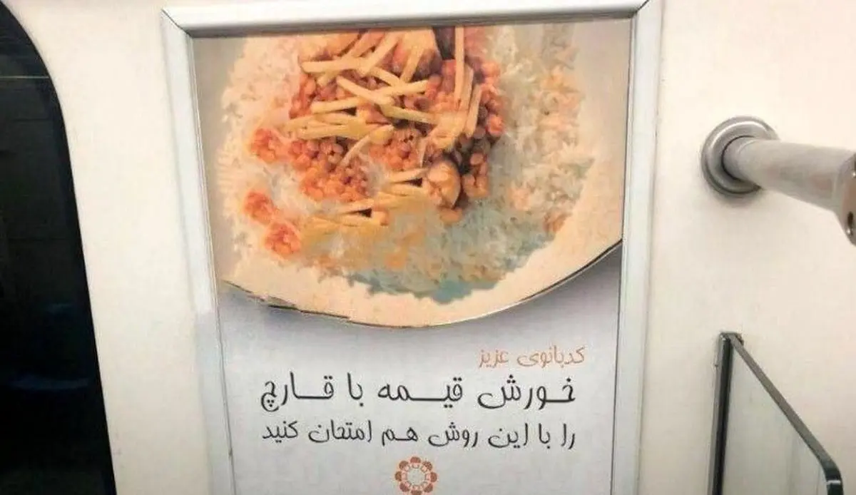 در این تبلیغ که روی دیوار واگن قطارهای مترو نصب شده است عکس بشقابی پر از پلو با خورش قیمه است که روی آن نوشته شده: کدبانوی عزیز!