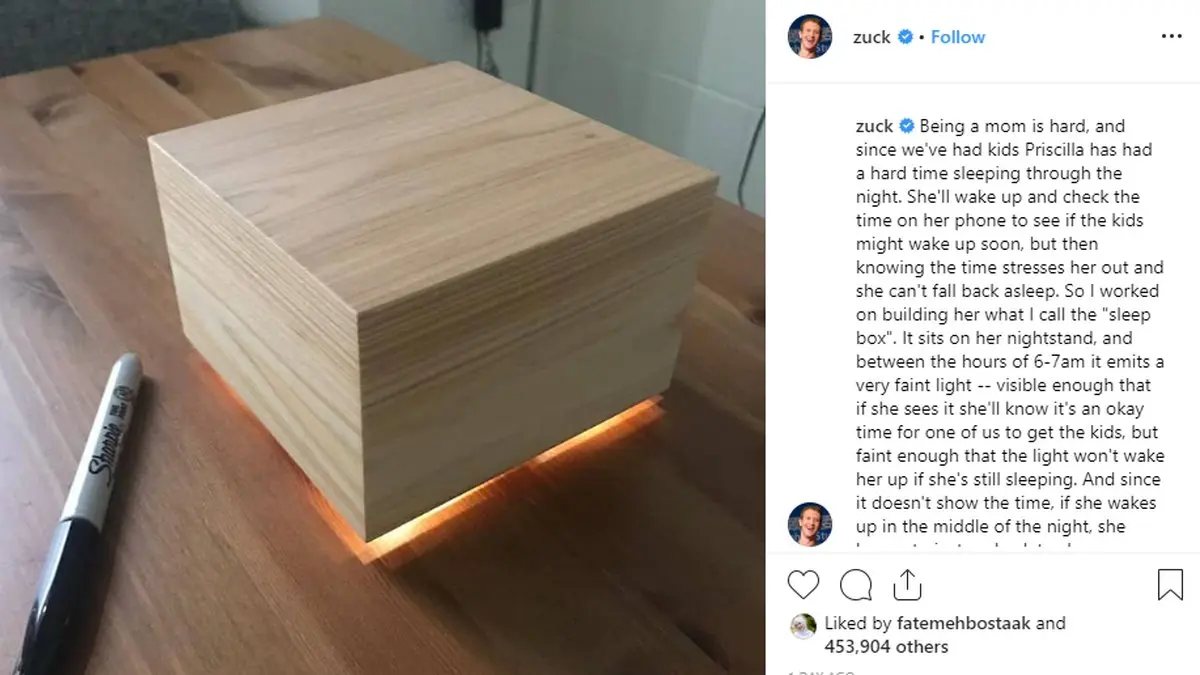خالق فیس بوک سعی کرده با کمک استعدادهای مهندسی خود به همسرش پریسیلا چان کمک کند راحت تر بخوابد. مارک زاکربرگ، تاکید کرده که هدفش از ساخت "جعبه خواب" چوبی این است که زودتر از همسرش بفهمد باید برای سر زدن به بچه ها اقدام کند.