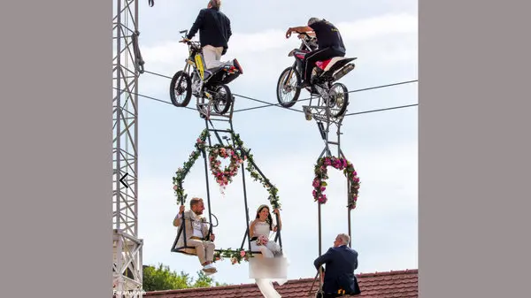 به گزارش رکنا ، "آنا ترابر" که خود در رشته بندبازی با موتورسیکلت مهارت دارد مراسم جشن ازدواج خود را در ارتفاع ۳۳ متری برگزار کرد.این مراسم در منطقه Breisach در نزدیکی شهر فرایبورگ برگزار شد و صدها نفر نیز آن را تماشا کردند. در این مراسم عروس و داماد و شهردار Breisach در ارتفاع ۳۳ متری حضور یافتند و مراسم را برگزار کردند.