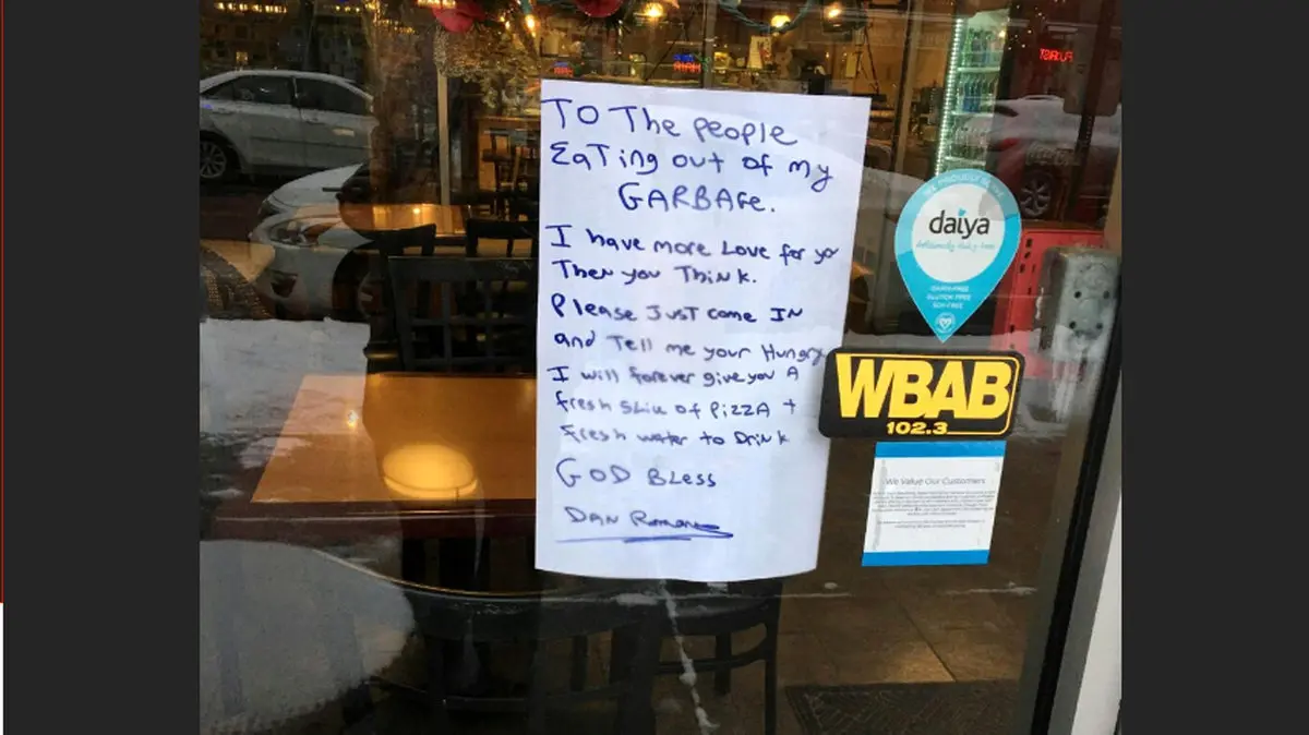 وی در یادداشتی که نوشته بود گفت : به مردمی که از سطل آشغالم غذا میخورند، من بیشتر ازونی که فکر کنین عاشقتونم، لطفا بیاین و بهم بگین گرسنه هستین تا من غذا و پیتزای تازه بهتون بدم.