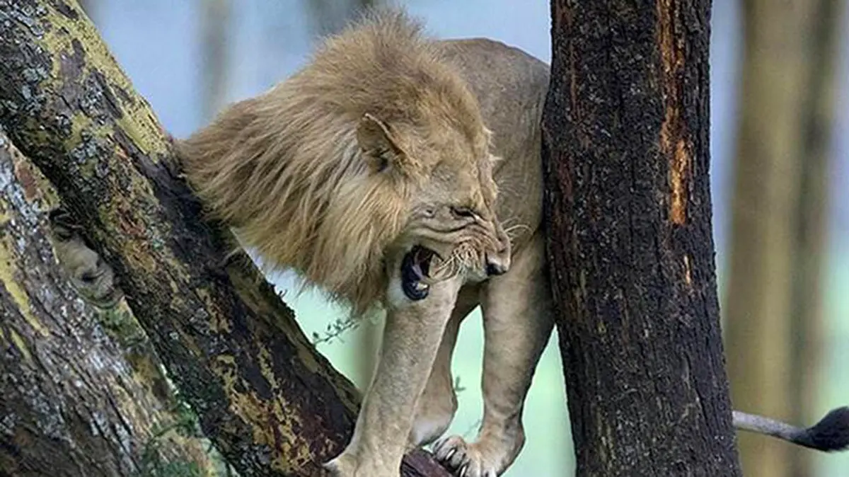 رکنا: صد گاومیش به سمت یک شیر در جنگلهای کنیا در حرکت بودند که شیر از ترس به بالای درختی پناه برد.