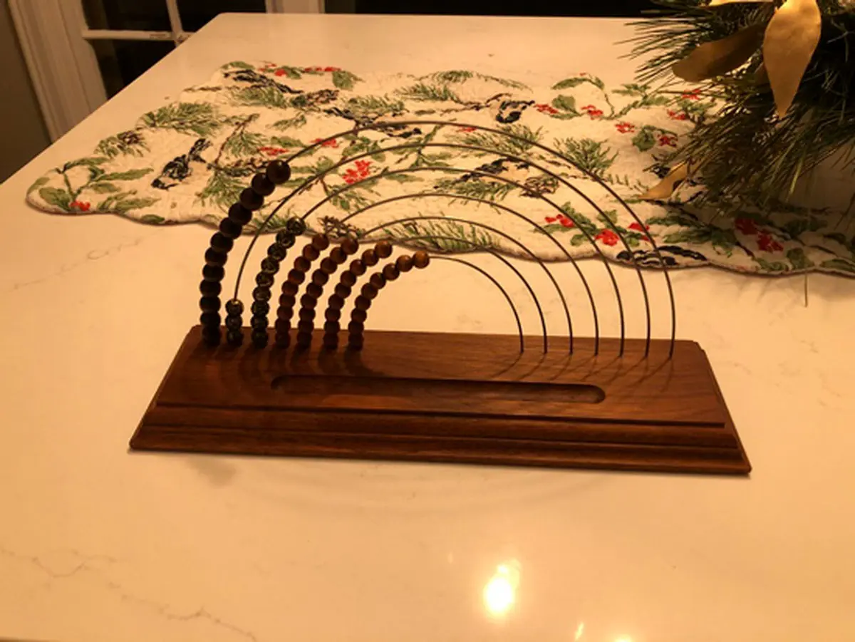 این یک تقویم هیمالیایی است. بزرگترین نیم دایره که ۱۲ مهره دارد ۱۲ ماه سال را نشان میدهد، دو نیم دایره بعدی، روزهای ماه را نشان میدهند (اولی سه مهره و دومی ۹ مهره دارد) و ۴ تای آخر، ۴ رقم سال را نشان میدهند.