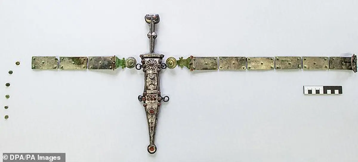 خنجر به قبیله باستانی رومی تعلق داشته که برای بریدن گوشت و جاری شدن خون رگه هایی روی آن حکاکی شده است.در کنار خنجر بقایای یک کمربند چرمی و روبان طلایی نیز بدست آمده است.