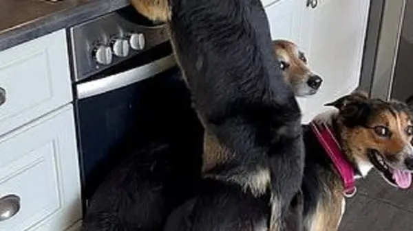این سه حیوان این عمل را دقیقا مانند یک انسان انجام میدهند؛ بدین صورت که دو سگ در پایین قرار گرفته و سگ سوم با ایستادن روی آنها تلاش میکند خود را به ظرف غذای روی میز آشپزخانه برساند.