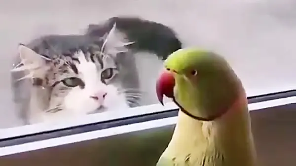 رکنا: طوطی بازیگوش از پشت پنجره یک خانه، سر به سر یک گربه گرسنه گذاشت.