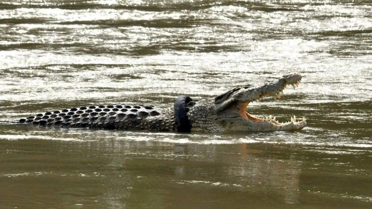 رکنا: تمساحی که لاستیک موتور به دور گردن آن است در رودخانه ای در استان سولاوسی مرکزی اندونزی.