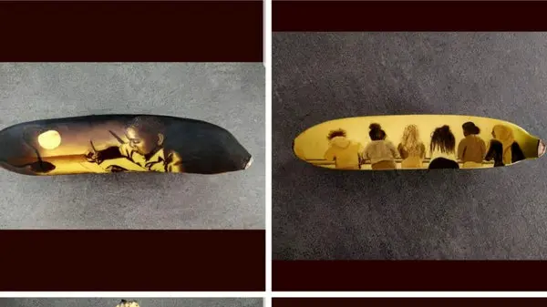 رکنا: در این نقاشیها هیچ جوهری استفاده نشده و یک خانم صرفا با حکاکی روی پوست موز این شکلها را به وجود آورده است.