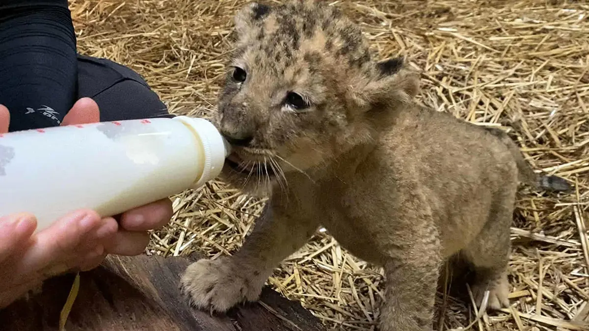 رکنا : تغذیه توله شیر با شیشه شیر را در این عکس آورده ایم.