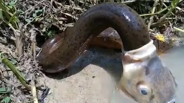 ماهی / این ویدئو بلافاصله پس از انتشار تبدیل به ویدئویی داغ شد. البته بسیاری از کاربران با دیدن این ویدئو اظهار داشتند که ماجرا آن چیزی نبوده که در این ویدئو نشان داده شده است. این ویدئو در تاریخ ۱۰ فوریه توسط «سوساندا ناندا»، مامور اداره جنگلبانی هند در توئیتر منتشر شد. آقای ناندا بدون توضیحی با طرح یک پرسش نوشت: «آیا تا به حال این (ویدئو) را دیده بودید؟» در ابتدای این ویدئوی منتشر شده عجیب یک ماهی (برخی آن را «کارپ»، نوعی ماهی که در دریاچهها و رودخانهها زندگی میکند دانسته اند) در حالی که سر خود را از آب بیرون آورده و از آبشش آن بخار بیرون میآید دیده میشود. سپس این ماهی بعد از چند بار تلاش سرانجام موفق میشود یک مارماهی را ببلعد.