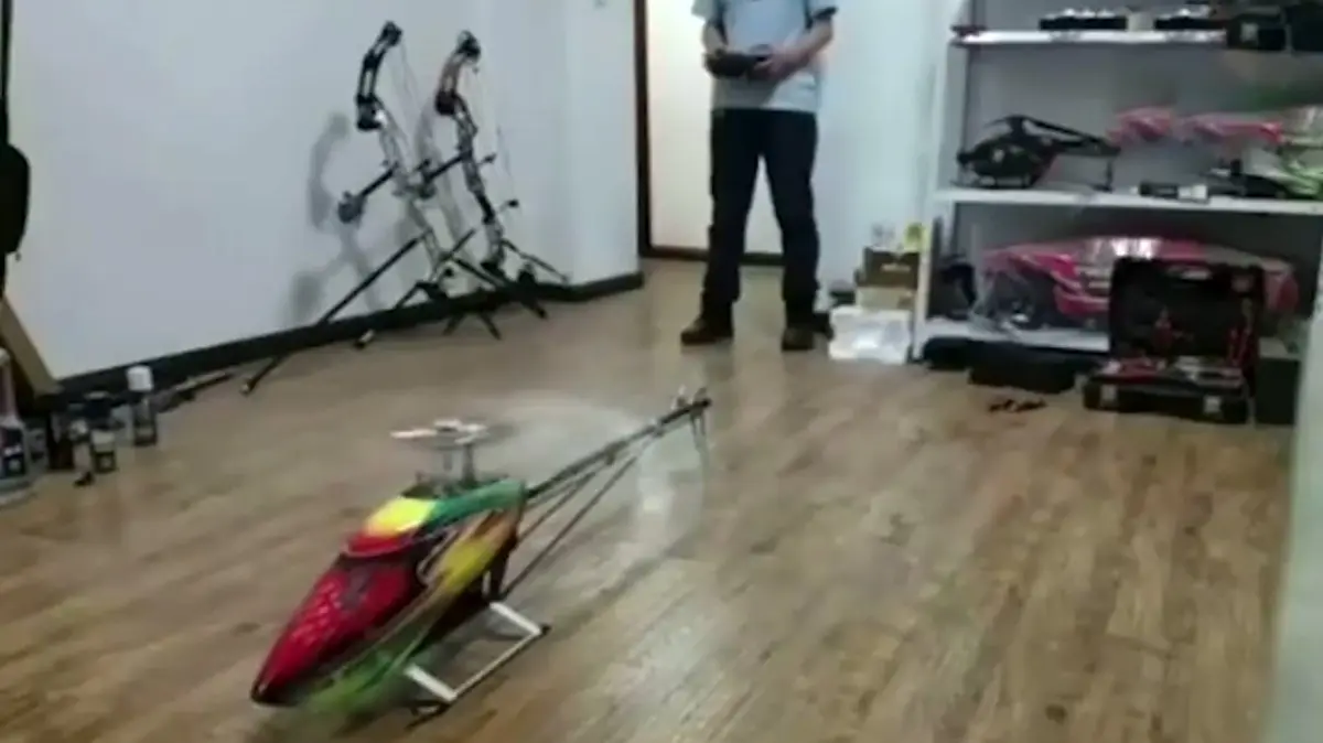 فردی در حال روشن کردن این هلیکوپتر با دستگاه به شکل دستی بود که ناگهان این هلیکوپتر از هم پاشید.