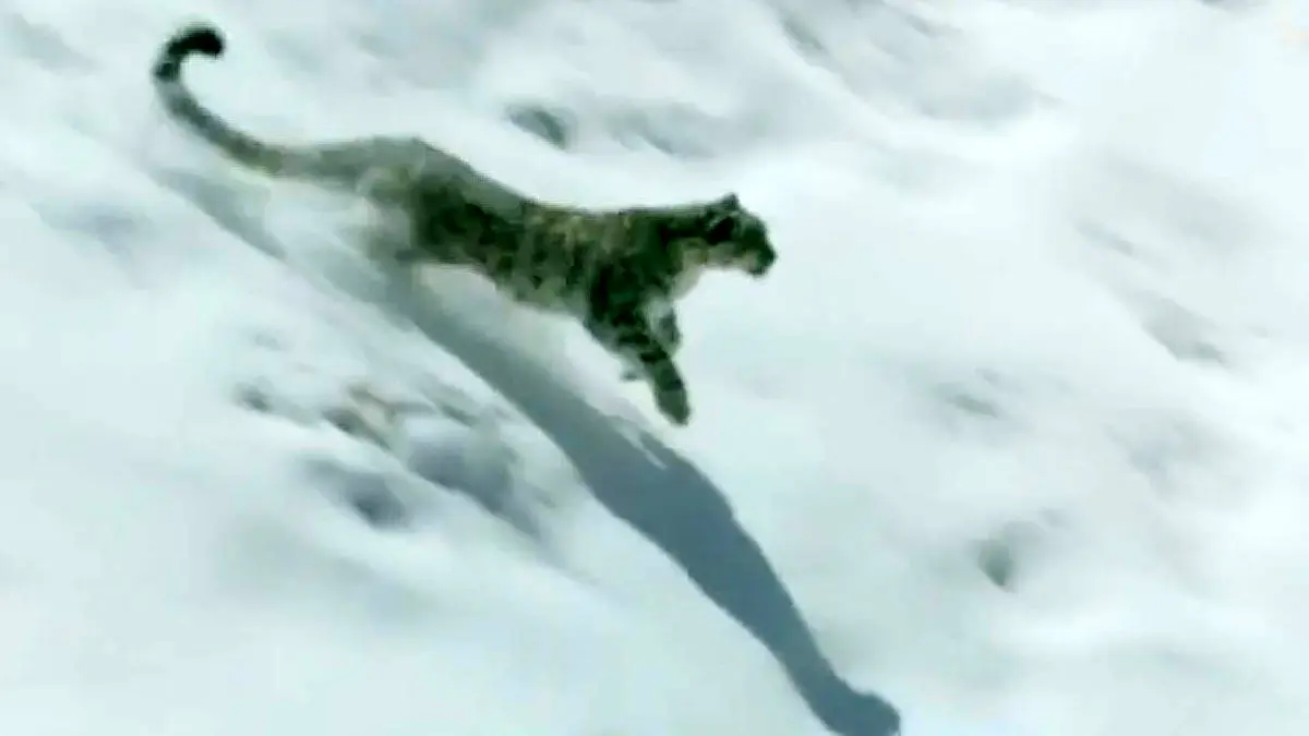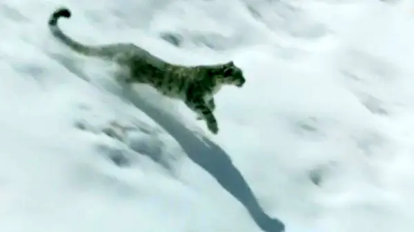 یک پلنگ گرسنه، با دویدن میان برف به دنبال شکار یک طعمه است.
