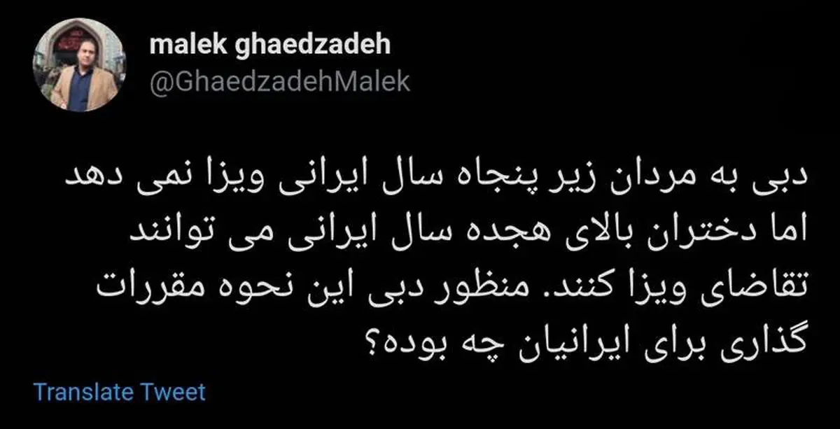 رکنا: یک کاربر فضای مجازی در توییتر نوشت: دبی به مردان زیر پنجاه سال ایرانی ویزا نمی دهد.