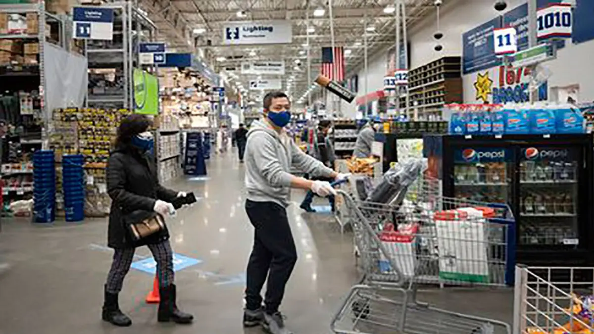 یک زن آمریکایی هنگام خرید، از وسیله مخصوصی برای پیشگیری از ابتلا به کرونا استفاده کرده است.