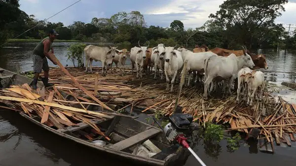 رکنا : سیل در برزیل جان گاوهای یک مرد را به خطر انداخت.