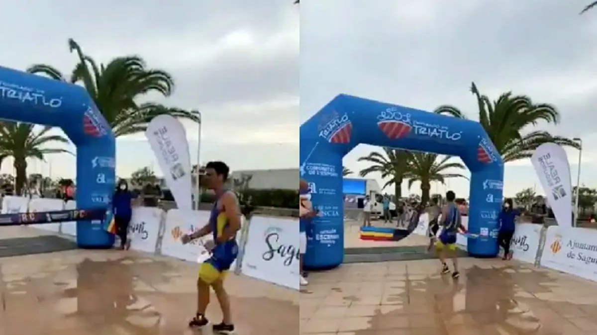 به گزارش رکنا ، ویدئویی که به تازگی منتشر شده اشت وقوع یک اتفاق عجیب در مسابقات دومیدانی ساگونتو تریتلون در اسپانیا را به تصویر میکشد. در این مسابقه در حالی که یکی از دوندگان تنها چند متر با خط پایان فاصله داشت مقام نخست را به راحتی از دست داد.