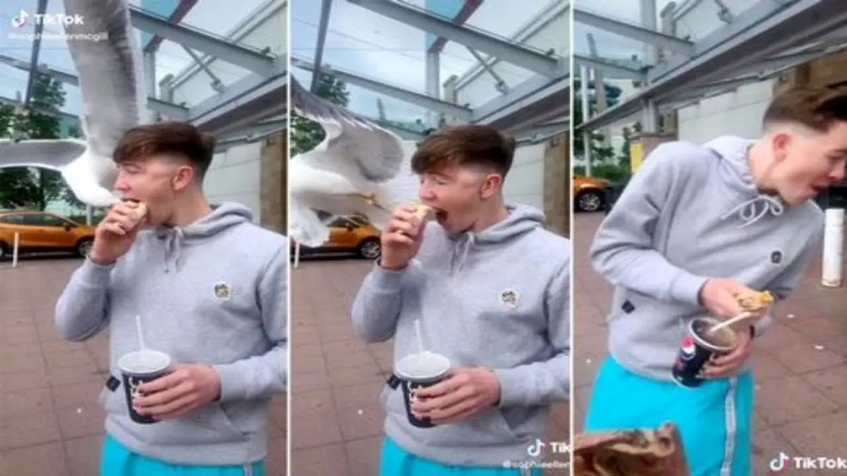 این ویدئوی ۱۴ ثانیه‌ای نشان می‌دهد، در حالی که این مرد جوان در خیابان ایستاده و مشغول خوردن غذا است ناگهان مورد حمله یک مرغ دریایی قرار می‌گیرد. در این ویدئو مشاهده می‌شود دقیقا در لحظه‌ای که این مرد قصد دارد یک لقمه غذا را در دهانش قرار دهد مرغ دریایی به او نزدیک شده و غذا را از دهانش می‌قاپد. این مرد که با وقوع این اتفاق کاملا شوکه شده است اقدام به فرار می‌کند.