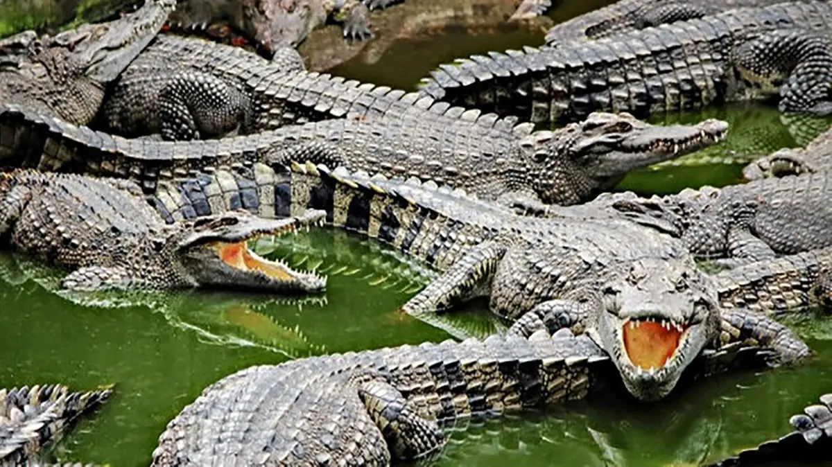رکنا : قدم زدن یک مرد در استخر تمساحها را مشاهده کنید.
