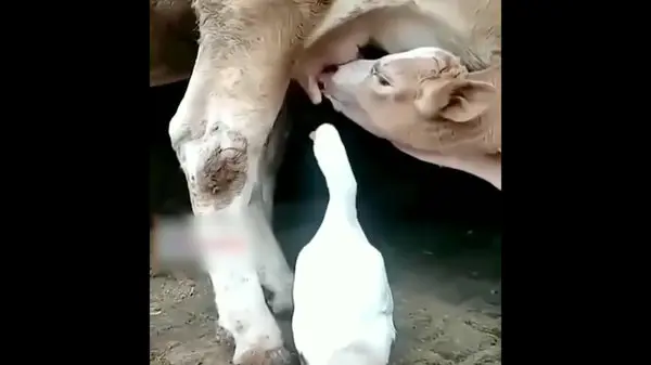 رقابت گوساله و غاز در شیر خوردن+ فیلم