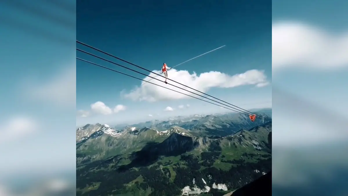 رکنا : یک فرد روی کابل های تله کابین در سوئیس به بندبازی پرداخت.
