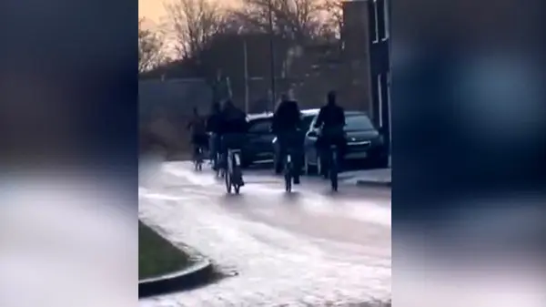 به گزارش رکنا، شخصی در حال فیلمبرداری از چند دوچرخه سوار است که در یک مسیر برفی در حال حرکت هستند و در پیچ، همگی با هم سُر میخورند.