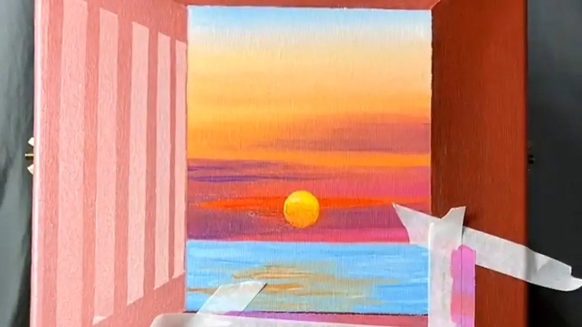 به گزارش رکنا، با استفاده از سطح یک مقوا و مقداری رنگ های متنوع و همچنین چسب کاغذی این نقاشی که در فیلم مشاهده می کنید خلق شده است. جالب است که برای بخشیدن فضای سه بعدی به آن از چسب کاغذی استفاده شده است و در نهایت خورشید و فردی که رو به ساحل دریا ایستاده است طراحی شد.