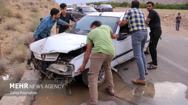 تلاش مردم برای نجات خودرو از سیل استهبان + عکس