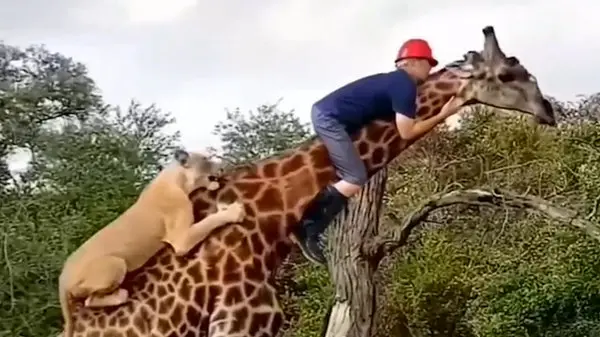 رکنا: زرافه ای را که در فیلم مشاهده می کنید مورد محاصره یک شیر و یک مرد قرار گرفته است.