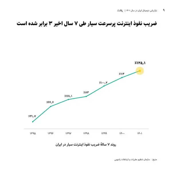 ضریب نفوذ اینترنت پرسرعت سیار طی ۷ سال اخیر ۳ برابر شده است و در پایان سال ۱۴۰۱، این عدد به بیش از ۱۲۵ درصد رسیده است