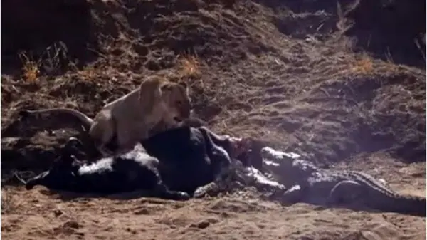 فیلم/ نبرد تماشایی تمساح و شیر برای تصاحب لاشه بوفالو