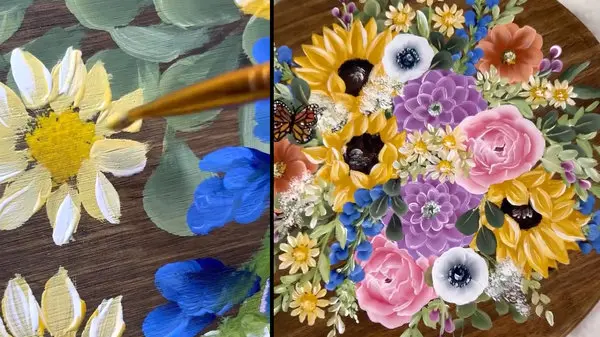 به گزارش رکنا، این نقاشی زیبا و رنگارنگ روی چوب تنها با آغشته کردن 2 سر قلمو به رنگ های مختلف زرد و نارنجی و بنفش و آبی و صورتی و ... ترسیم شده است. مطابق شکل با قرار دادن منظم و پیوسته قلمو روی سطح چوب می توان گل های رنگارنگ و زیبایی را کشید و برای تکمیل این باغ گل یک پروانه را هم ترسیم کرد که در لای گل ها مشغول پرواز است.