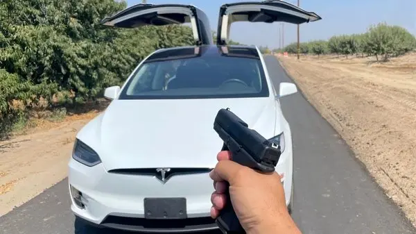 در این ویدئو ادوین سرکیسیان، بلاگ مشهور آمریکایی در حوزه سلاح به شیشه جلوی خودروی تسلا X شلیک می کند تا میزان عبور گلوله از شیشه را اندازه گیری کند.
