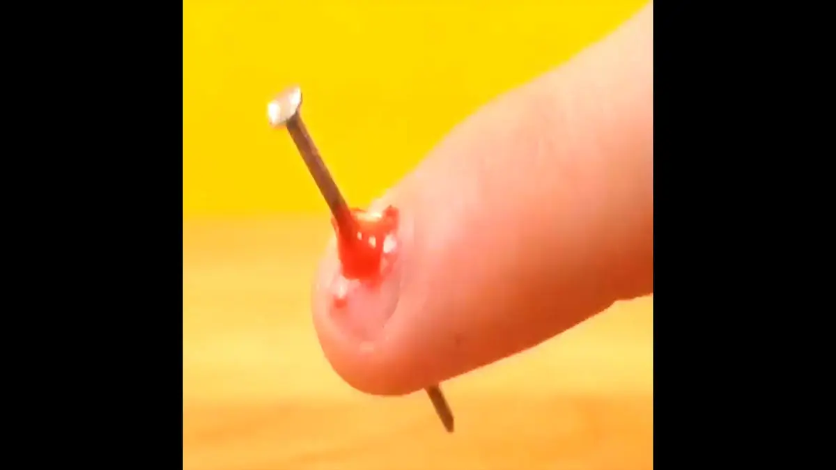 به گزارش رکنا، این فیلم شاید شما را بترساند اما نترسید! چون نوعی خطای دید است. در این فیلم مشاهده می شود که یک میخ را به 2 قسمت کرده و روی سر هر دو بخش مقداری چسب می ریزند. روی سر انگشت اشاره و ادامه آن از پشت یعنی قسمت داخلی کف دست هم مقداری چسب ریخته و در این 2 بخش گفته شده انگشت دست 2 بخش میخ را منطبق باهم به درستی می چسبانند. سپس بر ای طبیعی تر شدن کار از مقداری رنگ قرمز استفاده شده که در هر دو بخش میخ به کار می رود. شما در نهایت فکر می کنید که میخ در انگشت دست فرد فرو رفته و به خونریزی انگشت ختم شده است!