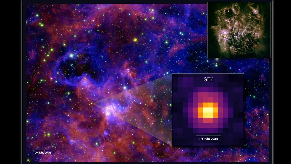 Complex organic molecules have been identified in the icy mantle on dust grains around the protostar ST6 in the Large Magellanic Cloud. (Image credit: NASA’s Goddard Space Flight Center)
