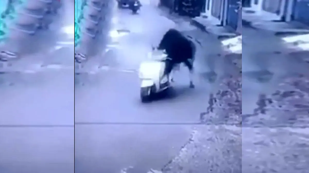 حوادث رکنا: در ویدئویی جالب در شهر ریشیکش واقع در ایالت اوتاراکند هند، یک گاو در حالی که در خیابانی خلوت پرسه میزد، ناگهان روی یک اسکوتر پارکشده پرید و شروع به حرکت دادن آن کرد.