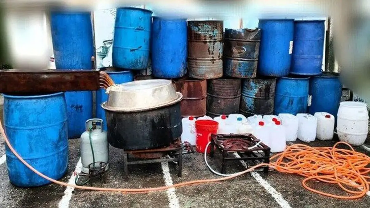 بر اساس اطلاعات به دست آمده عوامل اتباع در یکی از باغ های اطراف شهر شیراز که در حال تولید مشروبات الکلی فوق خطرناک با درصد های مختلف و استفاده از الکل های صنعتی جهت بالا بردن درصد الکل که موجب کور شدن افراد میشد و با کمک گزارش های مردمی ،چندین نفر دستگیر و از توزیع مشروبات جلوگیری شد.