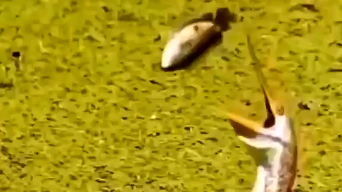 فیلم تلاش پرنده برای بلعیدن ماهی بزرگ