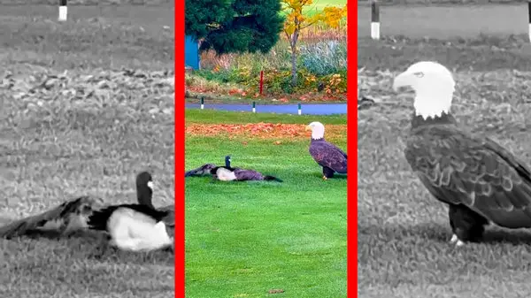 در یک صحنه نادر و دیدنی، عقاب سرسفید در پسزمینه یک زمین گلف، موفق شد یک غاز کانادایی را شکار کند. این اتفاق به دلیل توانایی محدود غازها برای برخاستن سریع از زمین رخ داد؛ عقابهای سرسفید معمولاً به شکار چنین طعمههایی علاقه دارند زیرا میتوانند با دقت و سرعت، شکار خود را در لحظه مناسب انجام دهند. این صحنه هم جذاب و هم آموزنده از رفتار شکارچیان طبیعت بود.