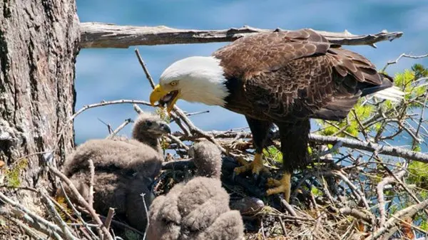 هدیهای از دل رودخانه ماهی برای جوجههای عقاب + فیلم