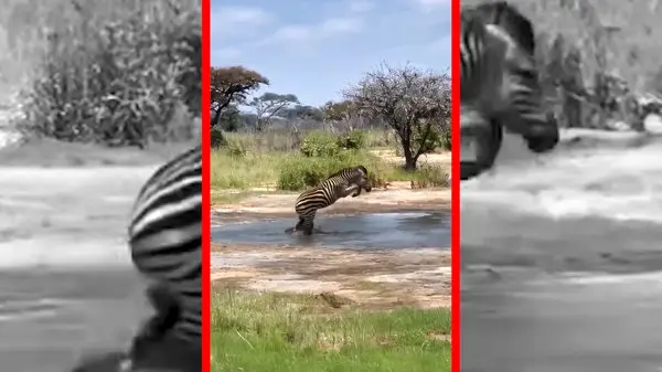 یک گورخر در برکه ای طبیعی، با هوشیاری و سرعت خود، از چنگ تمساح گرسنه نجات یافت. در این صحنه، تمساح به دنبال شکار گورخر بود، اما حیوان توانست با حرکات سریع و هوشیارانه، خود را از خطر مرگ نجات دهد.