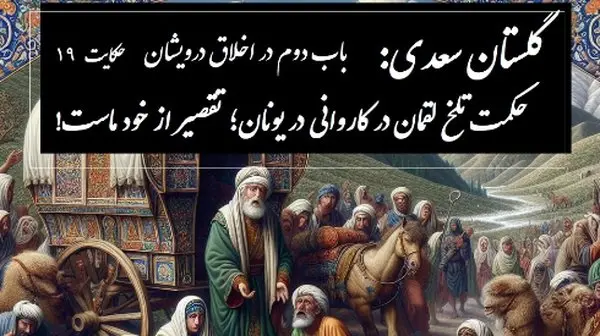 حکایات گلستان سعدی با خسرو شکیبایی: حکمت تلخ لقمان در کاروانی در یونان؛ تقصیر از خود ماست! / باب دوم در اخلاق درویشان حکایت شماره 19 + فایل صوتی و نسخه‌های قدیمی